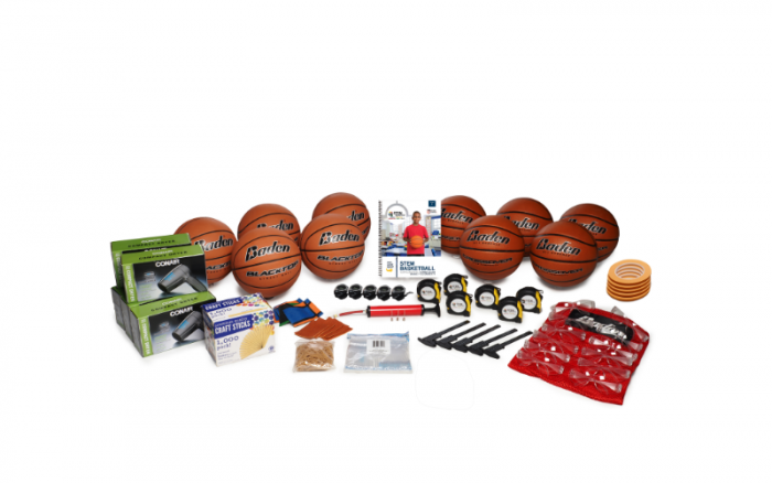 Full Kit: One (1) STEM Basketball Curriculum Manual, five (5) indoor basketballs, five (5) outdoor basketballs, five (5) 25’ tape measures, five (5) hair dryers, five (5) calipers, twelve (12) protective eyewear, five (5) cut ball swatches – indoor, five (5) cut ball swatches – outdoor, five (5) digital timers, five (5) rolls of masking tape, one thousand (1000) craft sticks, one hundred (100) plastic spoons, five-hundred (500) rubber bands, two (2) ball bags, one (1) ball pump, one (1) set of inflation needles.